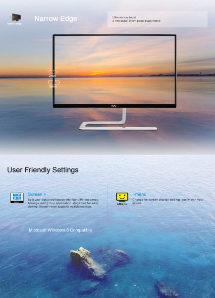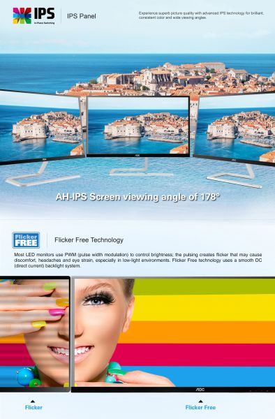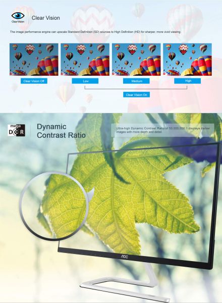 The impressive appearance extends to the display itself, which uses advanced IPS technology for brilliant, consistent color even at wide viewing angles. AOC Flicker Free technology uses a smooth backlight control system to reduce eye strain. Ultra-high Dynamic Contrast Ratio of 50,000,000:1displays darker images with more depth and detail, while the Clear Vision image performance engine can upscale Standard Definition (SD) sources to High Definition (HD) for even sharper viewing.