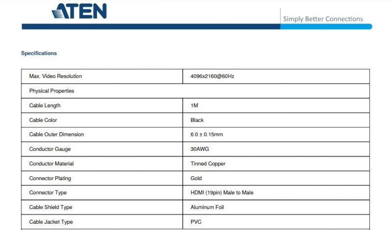 ATEN High Speed HDMI Cable with Ethernet provides an uncompressed, all-digital interface for both audio and video signals. Our cables infuse high-quality copper wire to resist interference for improved image clarity. We offer HDMI cable at lengths of 1 meters with resolutions up to True 4K(4096 x 2160 @60Hz 4:4:4)