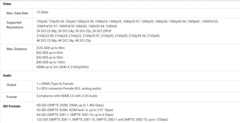 • 12G-SDI (SMPTE 2081-1, SMPTE 2081-10, SMPTE 2082-1 and SMPTE 2082-10, up to 12 Gbps) - Supports analog stereo audio output with RCA (R/L) connector