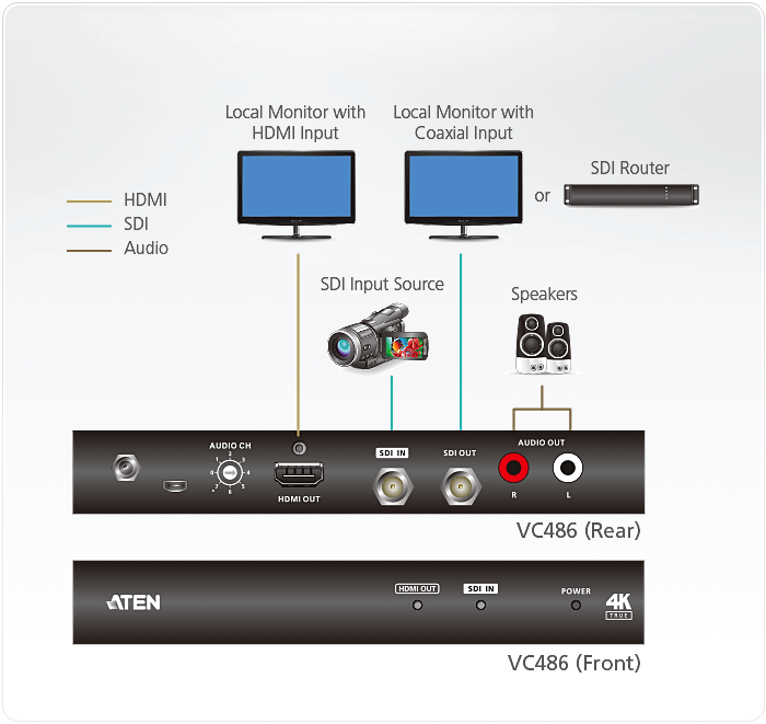 The VC486 is a 12G-SDI to HDMI 2.0 Converter that converts HD/3G/6G/12G-SDI input signals to an HDMI output in real time. It supports various transmission distances depending on different SDI formats, including 45 m (12G-SDI), 60 m (6G-SDI), 90 m(3G-SDI), and 150 m (HD-SDI), offering the flexibility for professional video projects. The VC486 is a perfect choice for applications such as using HDMI televisions as SDI broadcast monitors, and connecting to video projectors.