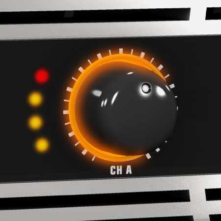 The front panel controls and indicators provide your system’s vital signs at a glance. After pressing the Power button, the Power LED lights to show the amp is ready for action. All channels feature positive-detent Gain controls with Signal LEDs that light when a signal is present, as well as Clip LEDs to indicate when the signal is distorted and you need to reduce the input signal.