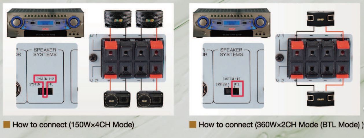 - BMB Digital Amplifier has three configuration, SYSTEM1:150Wx2channels, SYSTEM1+2:150Wx4channels, BTL:360Wx2channels, switch settings in the back.