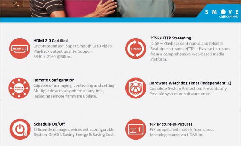 - Player setting with intelligence: update players firmware without IT resources, setting players reboot, sleep mode, mute, brightness with routine schedule.