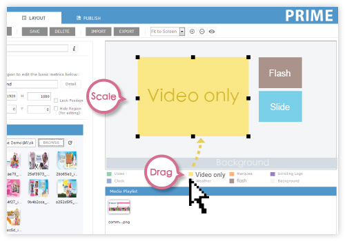PRIME is a content management system that are provided along with Digital Signage player. It is easy to manage your signage contents with PRIME to any computer.