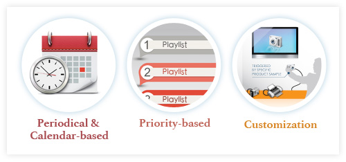 - Periodical Scheduling: Playlist setup by Daily/Weekly/Monthly timeframe routine.