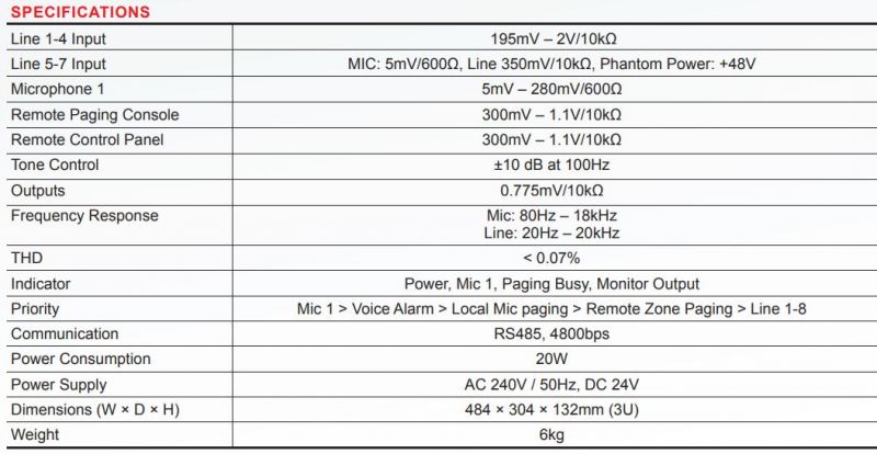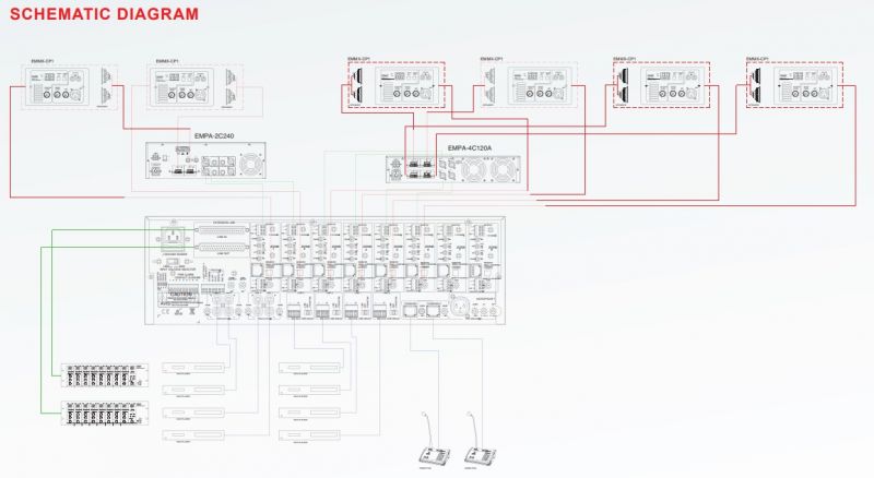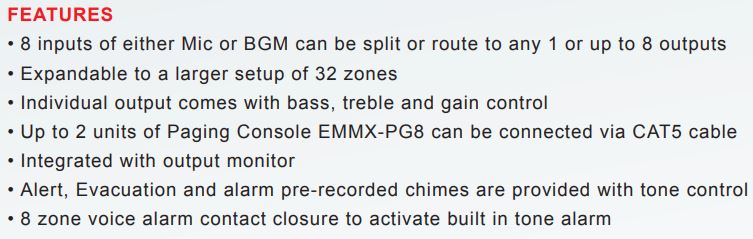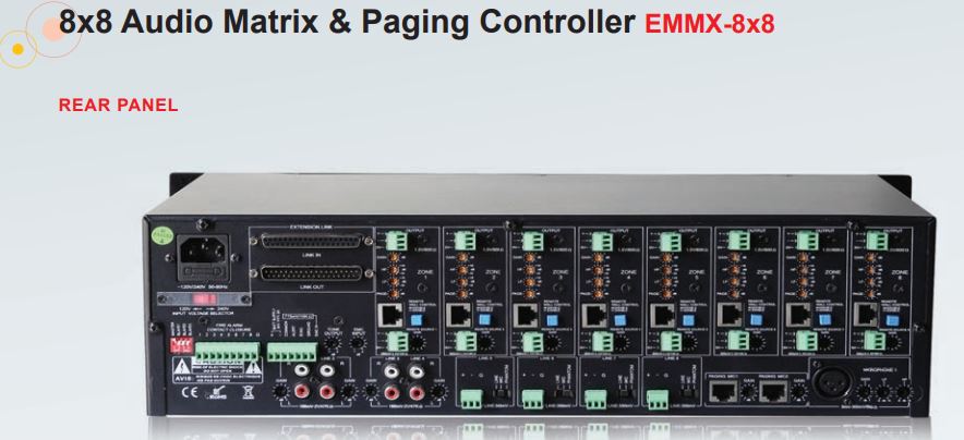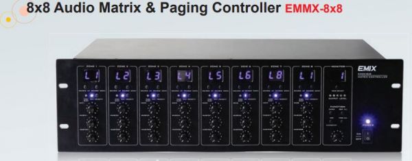 EMIX EMMX-8×8, audio matrix and paging system is suitable for multi sources system where different arearequired different BGM (Back Ground music). For example hotels, shopping mall, club house, gym room etc.