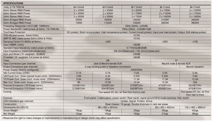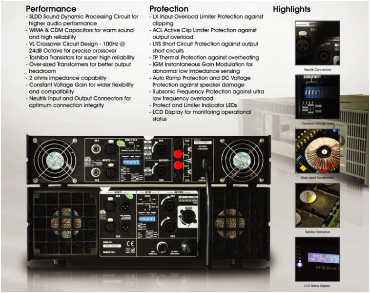 The M-Series MK II amplifiers combine robust, reliable and precise power with in-built comprehensive protection systems. The new M-Series MK II boasts of improved design and audio performance throughout the versatile range of models, and also a multitude of precision user controls, protection circuitry and an LCD status display to ensure long term reliability to withstand the high demands of today’s pro-audio users.