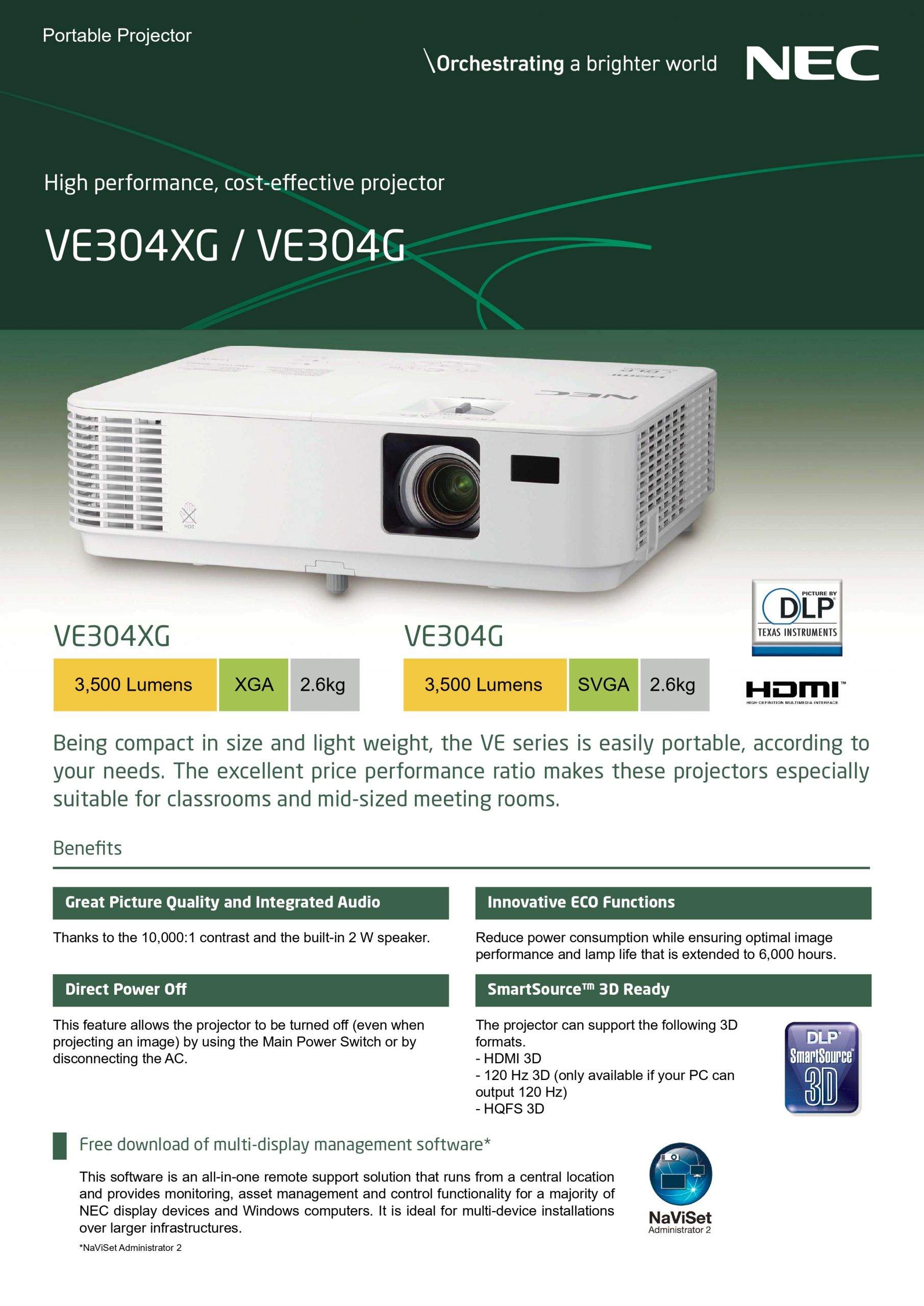 Being compact in size and light weight, the VE series is easily portable, according to your needs. The excellent price performance ratio makes these projectors especially suitable for classrooms and mid-sized meeting rooms.