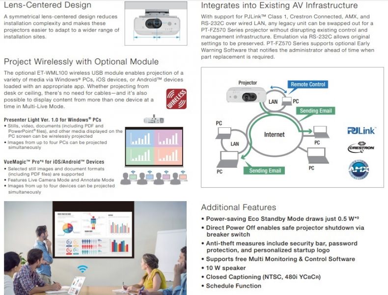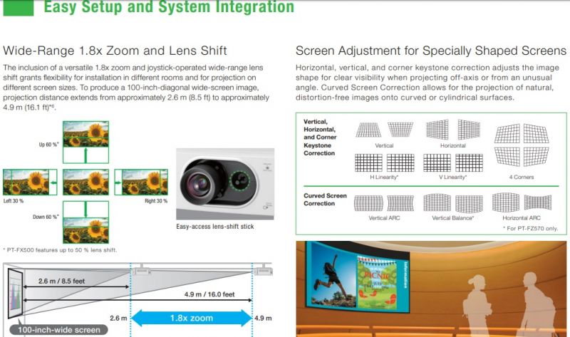 - Wide-range manual lens shift, 1.8x zoom lens for picture adjustment