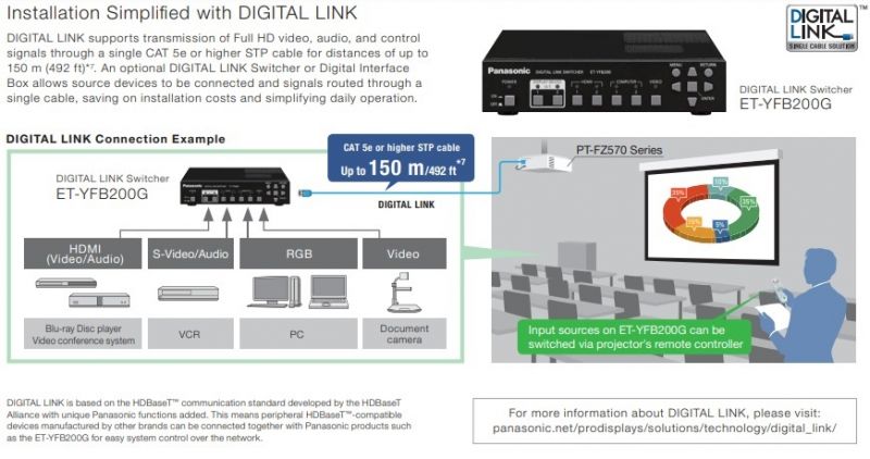 - DIGITAL LINK supports transmission of uncompressed full HD video, audio, and control commands through a single CAT 5e or higher STP cable for distances of up to 150 m (492 ft)*6
