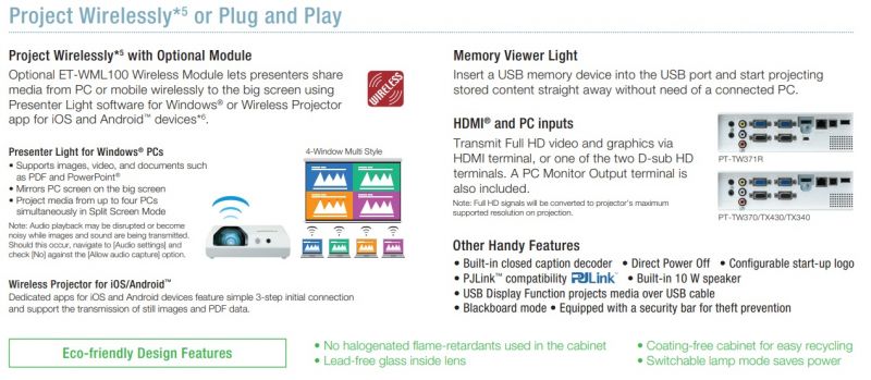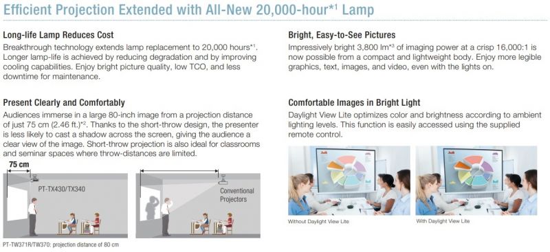 Step back and soak up a shadow-free 100-inch image you can reach out and write on, all from a compact short-throw projector that’s breaking records for efficiency. Designed for easy handling and operation, the wireless interactive PT-TX430 connects to laptops, mobiles, and other sources that suit your presentation needs, and its high brilliance and quiet running are perfect for office or classroom. Administrators will love the all-new 20,000-hour lamp life—a feature that cuts TCO to vanishing levels. Flexible projection in small spaces? The PT-TX430 waits to impress.