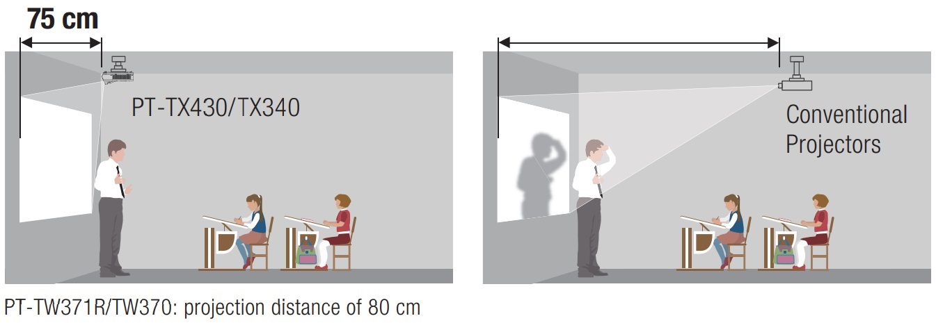Step back and soak up a shadow-free 100-inch image you can reach out and write on, all from a compact short-throw projector that’s breaking records for efficiency. Designed for easy handling and operation, the wireless interactive PT-TW371R Series connects to laptops, mobiles, and other sources that suit your presentation needs, and its high brilliance and quiet running are perfect for office or classroom. Administrators will love the all-new 20,000-hour lamp life—a feature that cuts TCO to vanishing levels. Flexible projection in small spaces? The PT-TW371R Series waits to impress.