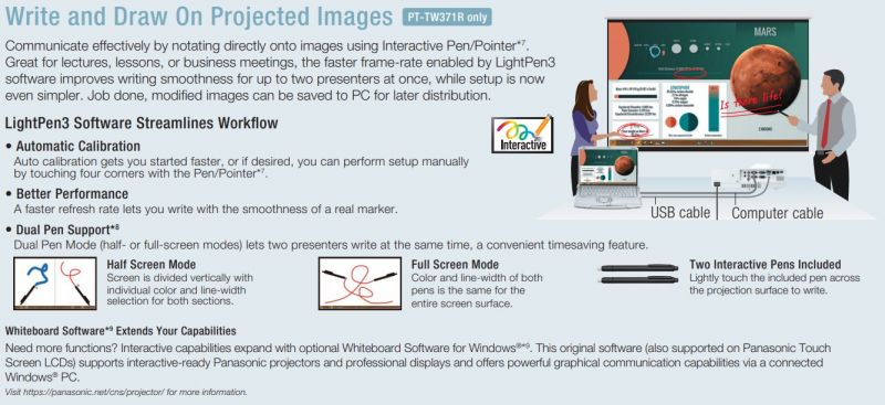 You can write or draw figures on the projected image with the Interactive Pen/Pointer. In addition, two users can write simultaneously to make classes and presentations more effective. It is also easy to store the words and figures in a computer for information sharing.