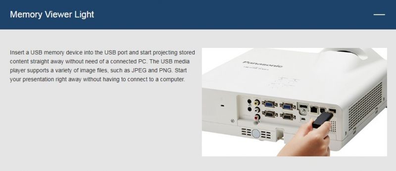 In addition to JPEG/BMP image and text files, PDF files can be projected by simply inserting a USB memory device containing the data into the USB memory port. Now you can start your presentation without having to connect to a computer.