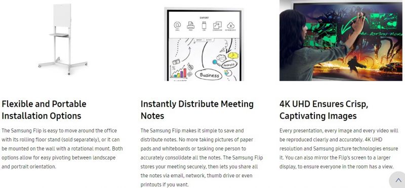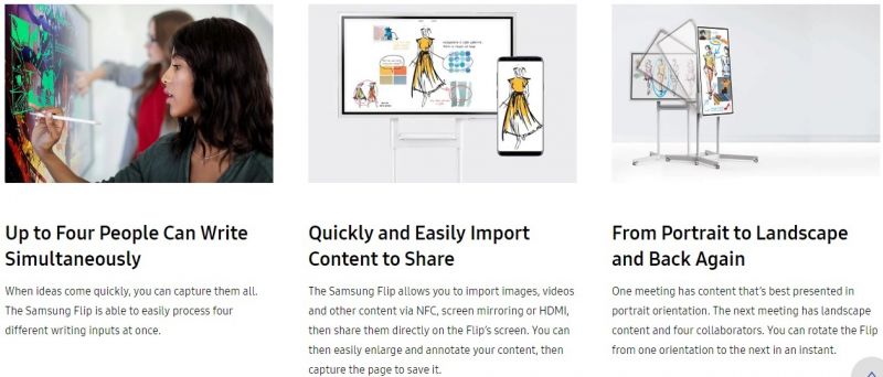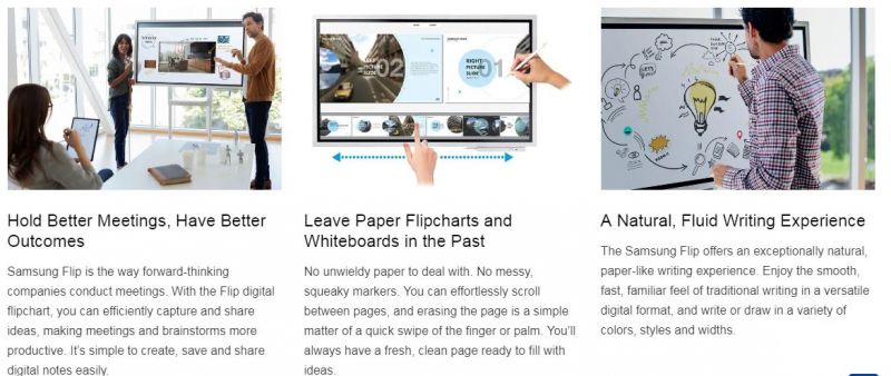 Samsung Flip is an interactive display that streamlines productivity and enables efficient collaboration. With Samsung Flip, meetings can take place anywhere and at any time, with all vital aspects included. Take a closer look at how Samsung Flip can help you and your team work smarter, faster and better. The Samsung Flip is an innovative digital flipchart that helps to drive more productive and efficient business collaboration without the hassle. With the Samsung Flip interactive display, your team can work smarter, faster and better. Business meetings can take place anywhere, anytime, and you can take the stress out of the logistics.
