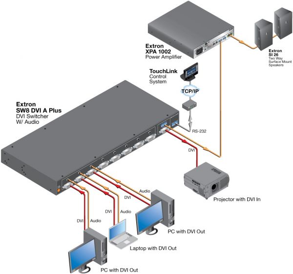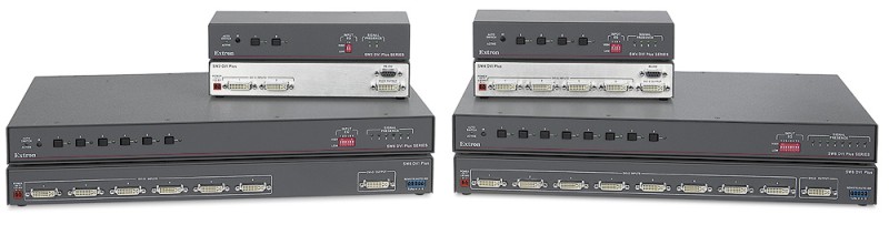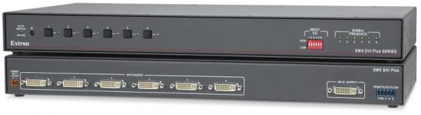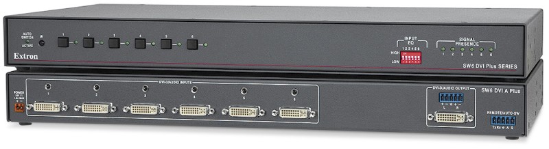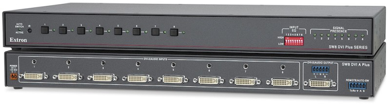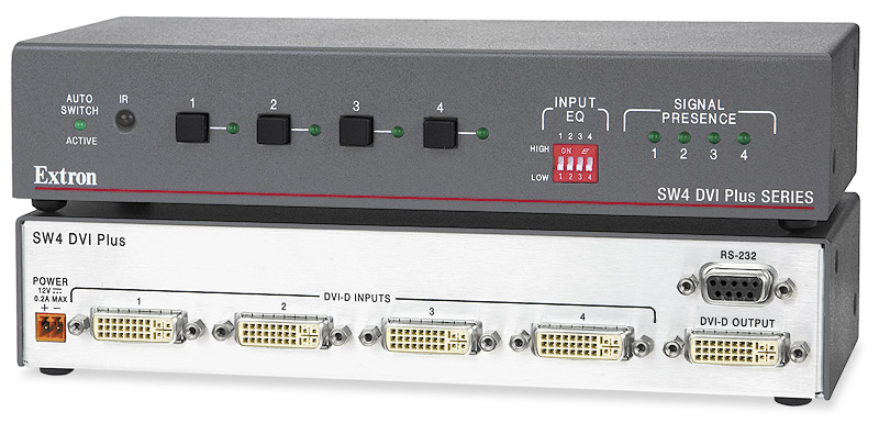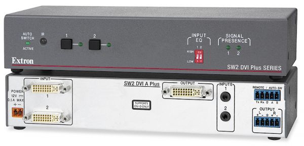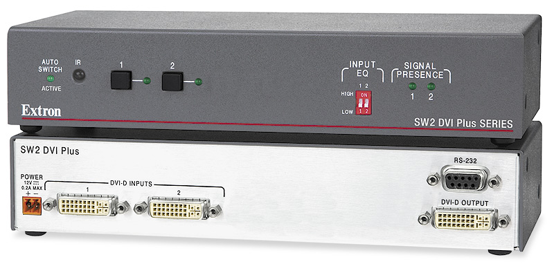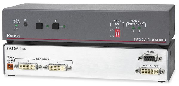 The Extron SW DVI Plus Series two input single link DVI switchers are available with or without stereo audio switching. They are compatible with PC resolutions up to 1920×1200, including HDTV 1080p/60 and 2K. They feature EDID Minder®, which maintains continuous EDID communication with connected devices and ensures that the DVI sources power up properly and maintain correct video output. The switchers ensure signal integrity by equalizing and regenerating the incoming signal. The SW DVI Plus Series switchers are ideal for applications that require the routing of two DVI sources to a single display.