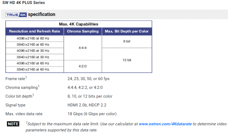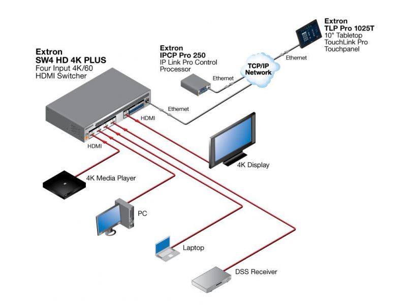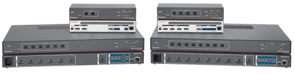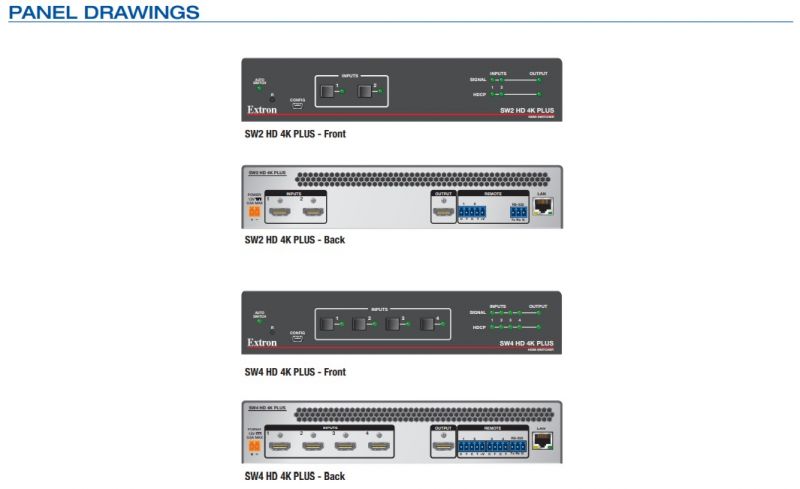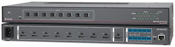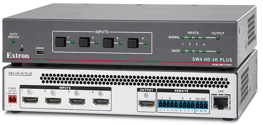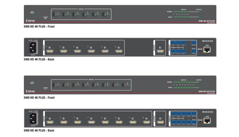 The Extron SW HD 4K PLUS Series of two, four, six, and eight-input HDMI switchers support 4K/60 with 4:4:4 color sampling. They are designed for video signal switching between multiple HDMI sources to a single display. The switchers are HDCP compliant, and support data rates up to 18 Gbps, HDR, 12-bit Deep Color, 3D, and HD lossless audio formats. The SW HD 4K PLUS Series is easy to operate using front panel controls or auto-switching. Ethernet, RS-232, and contact closure ports provide ample options for integration with any control system. All models feature EDID Minder®, which maintains continuous EDID communication with connected devices and ensures that the HDMI sources power up and maintain video output. The switchers provide automatic input cable equalization up to 25 feet (7.6 meters) on Extron HDMI Pro Series cable.