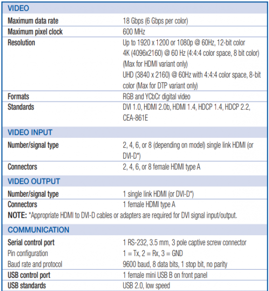 The SW HD 4K PLUS Series two and four‑input models are housed in 1U, half rack width enclosures that are suitable for mounting in a rack or under a table. The six and eight‑input models are housed in 1U, full rack width enclosures and come standard with brackets for mounting in a rack.