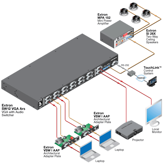 - Compatible with Extron VSW I AAP — The optional VSW I AAP provides remote input connection and selection, which is useful in multiple-participant presentation environments.