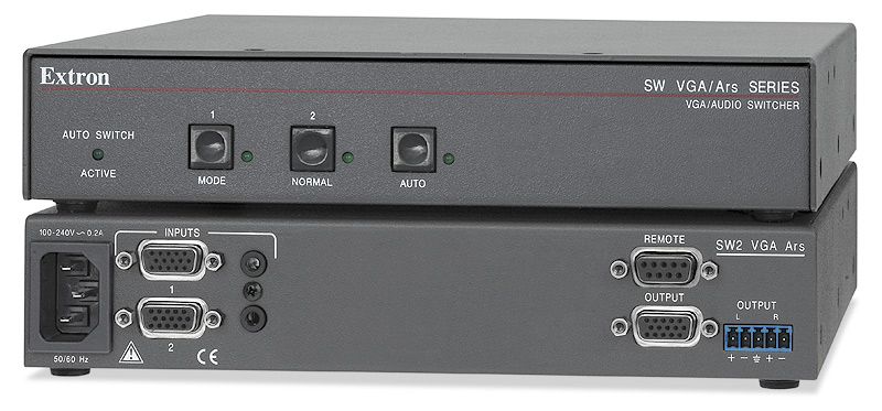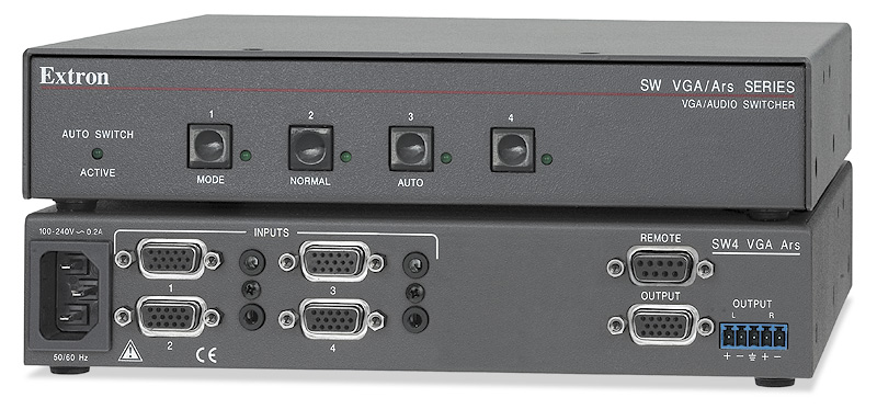 The Extron SW VGA are two and four input VGA switchers with stereo audio. They provide video signal switching between multiple, high-resolution computer video or HDTV component video sources and a single display. The switchers provide 300 MHz (‑3 dB) RGB video bandwidth and are compatible with VGA‑QXGA and HDTV component video signals. SW VGA features auto-input switching, input signal sensing, and active computer audio buffering. Multiple control capabilities that include front panel, RS‑232, contact closure, and an optional Extron IR 102 handheld remote control allow for ease of integration into a variety of environments.