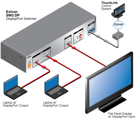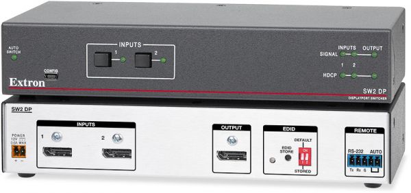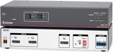 The Extron SW2 DP is a two input, one output DisplayPort switcher. The SW2 DP is HDCP compliant and supports data rates up to 10.8 Gbps and computer resolutions up to 2560×1600 @ 60 Hz. It features EDID Minder®, which maintains continuous EDID communication with connected devices and ensures that the DisplayPort sources power up properly and maintain correct video output. The SW2 DP provides automatic input cable equalization up to 25 feet (7 meters) on Extron DisplayPort cable. Multiple control points, including front panel, RS-232, and auto-input switching, simplify integration into a variety of system designs. The SW2 DP switcher is ideal for applications that require the routing of two DisplayPort sources to a single display.