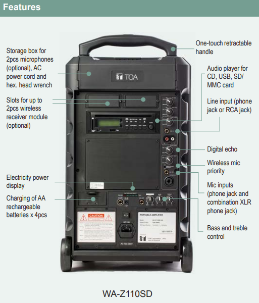 TOA WA-Z110SD Portable Amplifier offers reliable performance, clear, powerful sound and is simple to operate. This portable sound system is equipped with an audio music player that allows music to be played from CD, USB or SD/MMC card. For speech use, this unit has the option of installing up to 2 pieces of UHF wireless receivers to be used with the optional wireless handheld or lavalier microphone.