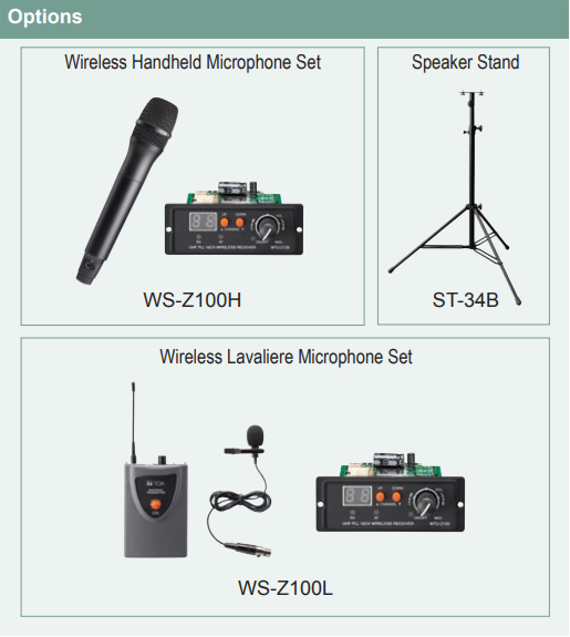 Option | WS-Z100H AS set (WM-Z100H Handheld Mic & WTU-Z100 Wireless Receiver) WS-Z100L AS set (WM-Z100L Lavaliere Mic & WTU-Z100 Wireless Receiver) Speaker stand: ST-34B |