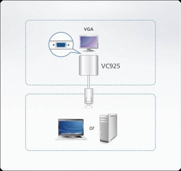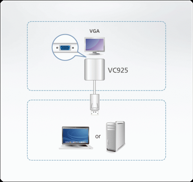The VC925 is a DisplayPort to VGA adapter, allowing you to connect your device’s DisplayPort output to the VGA input of a TV or other display. The VC925 provide a cost-effective yet high performance signal conversion solution. This adapter is therefore perfect for computers and notebooks, supporting display resolutions of up to WUXGA (1920×1200@60Hz).