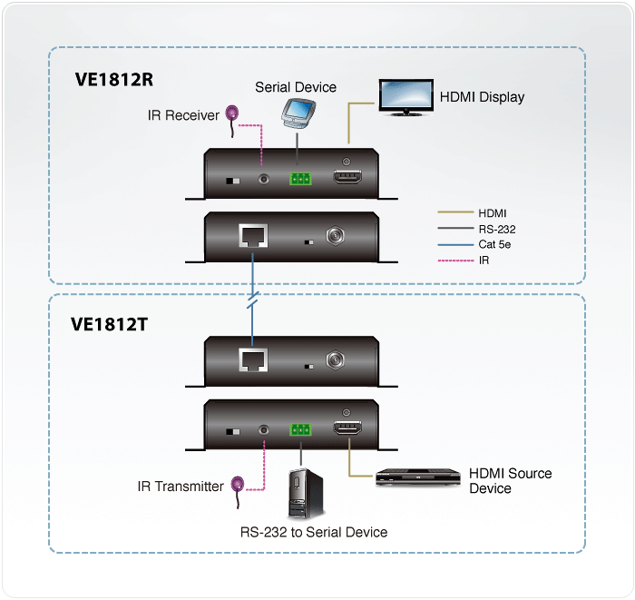 The VE1812 supports RS-232 and IR signaling pass-through, allowing you to control the HDMI source device from the receiver unit (VE1812R) while also accessing the HDMI display device from the transmitter unit (VE1812T). The IR signals can also be extended in both directions.