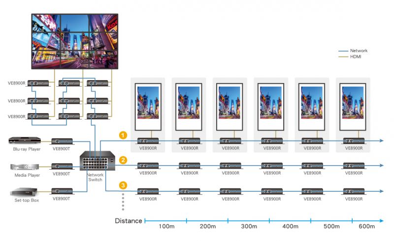 Engineered to meet today’s demands of large scale, multi-display, 1080p signal transmission, and designed to be easy to set up and operate, the VE8900T Video over IP Transmitter is an ideal product for a wide range of environments, such as trade shows, airports, university campuses, conference centers, and shopping centers.