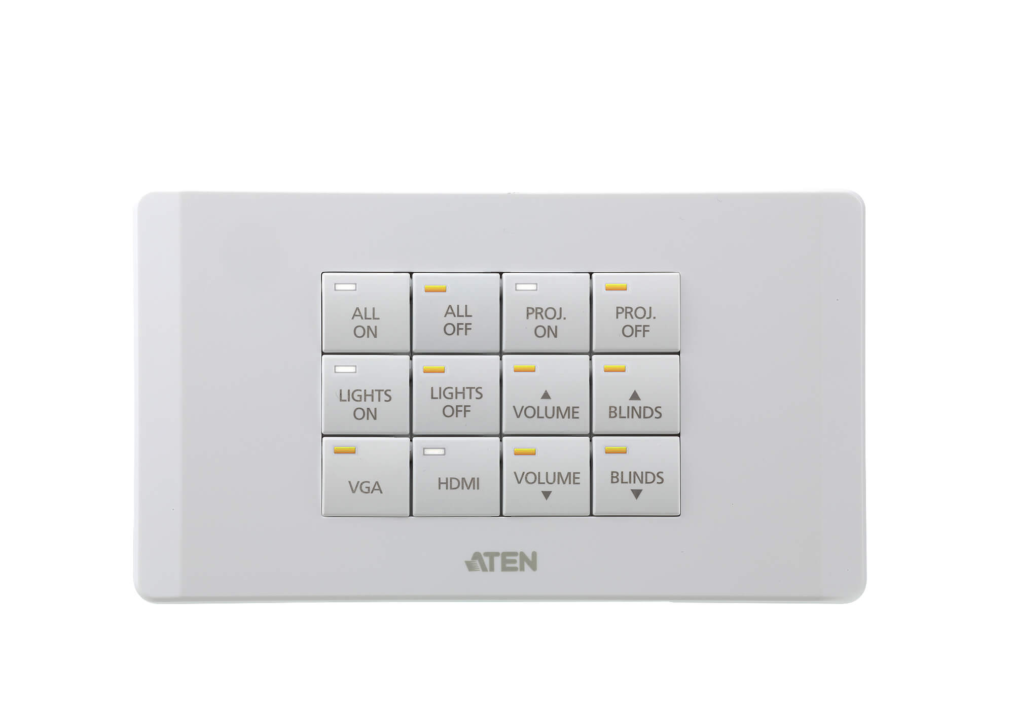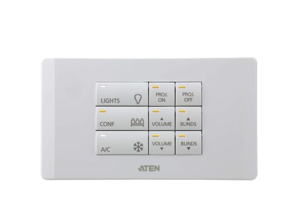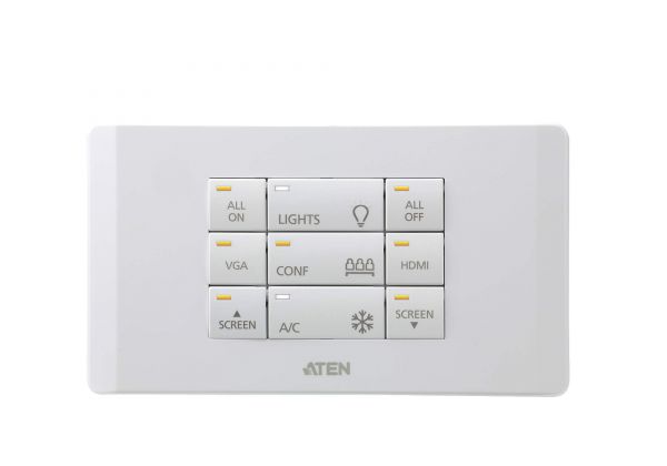 The VK112EU is a fully-customizable 12-button keypad designed for use with the ATEN Control System. The keypad provides an interface to control devices in a room from a standard wall mounted faceplate. Created with flexibility in mind, the 2-gang keypad can be laid out in 125 different combinations of 6 to 12 buttons that snap together as easy as Lego’s. By connecting to the VK2100/VK1100 Control Box over a LAN, users will find it’s effortless using VK6000 software to configure the desired control of any connected device from the keypad. With the buttons ready to go, you have instant and smart control of the facilities from a keypad or keypads that can manage any device in the room. The VK112EU is an affordable solution, perfect to serve as the primary interface in meeting rooms, or as secondary device control in classrooms and conference centers.