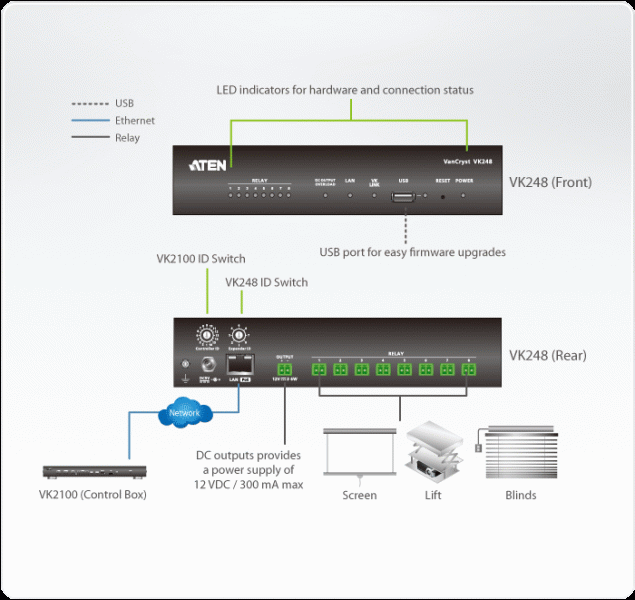 The VK248 8-Channel Relay Expansion Box provides an additional eight channels of relay output for a flexible expansion of the ATEN Control System. This allows users to control additional devices such as screen, projector lifts and blinds in environments where more devices are required. With the advantage of an Ethernet-based connection, the expansion box easily connects to the VK2100 Control Box via a LAN connection from a variety of locations across a network.