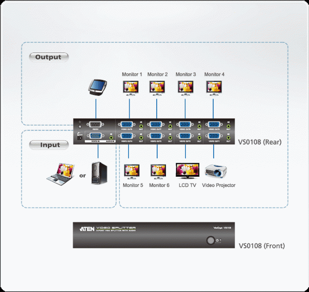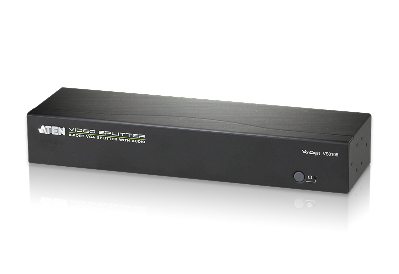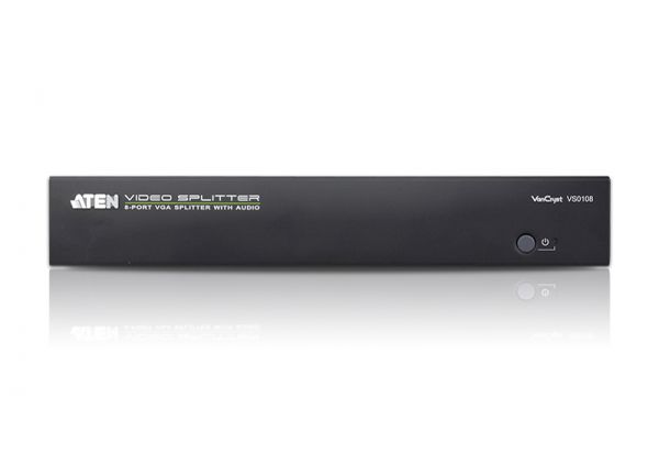 The ATEN VS0108 8-Port VGA Splitter with Audio is VGA splitter that allow a single VGA video & audio signal to be distributed to eight output displays with independent stereo control. The splitter support up to 400MHz video bandwidth, which provides optimum video quality, supported by resolutions up to 1920×1440.