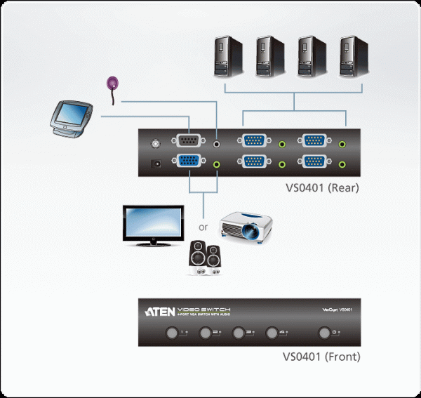 The VS0401 4-Port VGA Switch with Audio allows you to connect four audio/video source computers to a single monitor or projector with full audio and quickly switch between the devices for use.