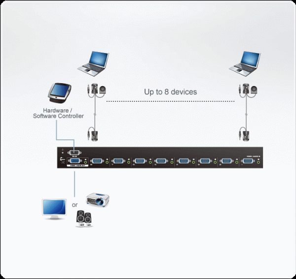 The VS0801A 8-Port VGA Switch with Auto Switching,connecting eight audio/video source notebooks to a single monitor or projector with full audio will enable you to quickly switch between the devices for any presentation occasions where multiple audio/video playing are simultaneously required, such as meeting room, media centers, class rooms etc.
