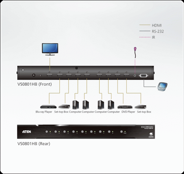 Engineered to meet today’s demand of True 4K signal transmission and user-oriented design, the ATEN VS0801HB is a powerful solution for a wide range of settings, such as home theater, meeting rooms, trade shows, and shopping centers.