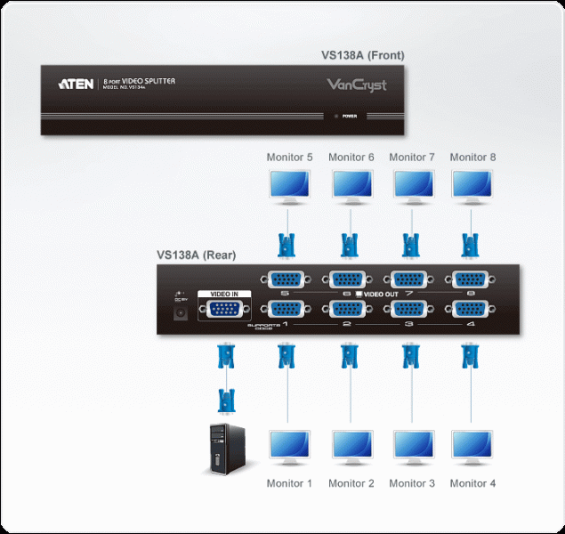 The VS138A Video Splitter is a boosting device that duplicates a video signal from one source to 8 output devices. Cascadable to three levels, the VS138A provides up to 512 video signals, in addition to extending transmission distance up to 30 m, making it excellent for public broadcast systems.