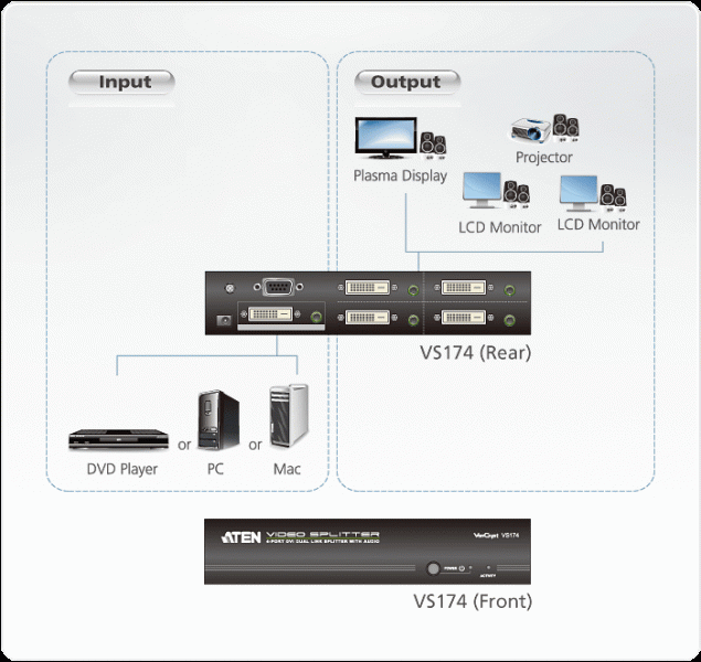 The VS174 4-Port DVI Dual Link Splitter with Audio combines DVI quality video and audio, taking signals from an audio/ video source and replicating them to four audio/video outputs. This video splitter uses dual link technology, which offers high bandwidth capacity for added transmission power and faster refresh rates, thereby providing better video quality of viewing resolutions up to 2560 x 1600.