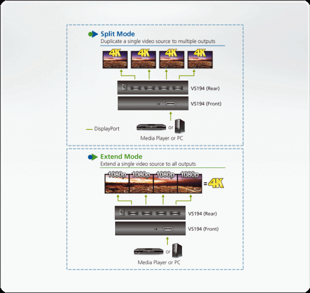 The VS194 4-Port 4K DisplayPort Splitter is the perfect solution for anyone who needs to send one source of DisplayPort high definition video to two or four DisplayPort displays. The VS194 can not only split but also expand DisplayPort audio/video signal on two or four DisplayPort monitors which is ideal for any multi-display application.