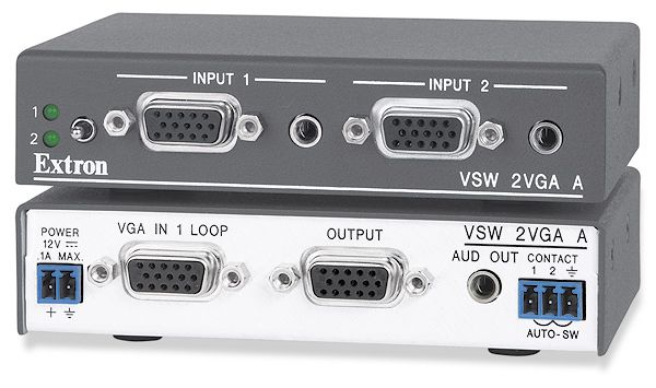 The Extron VSW 2VGA A is a compact and economical two input, one output, active switcher for VGA and stereo audio. It allows users to select between two VGA sources with audio and route the selected source to a video output device such as a data monitor or projector. In addition, the VSW 2VGA A provides a buffered local monitor output for input one. Multiple VSW 2VGA A switchers can be daisy-chained using Extron high performance pre-fabricated VGA cable to create a multi-user presentation system.